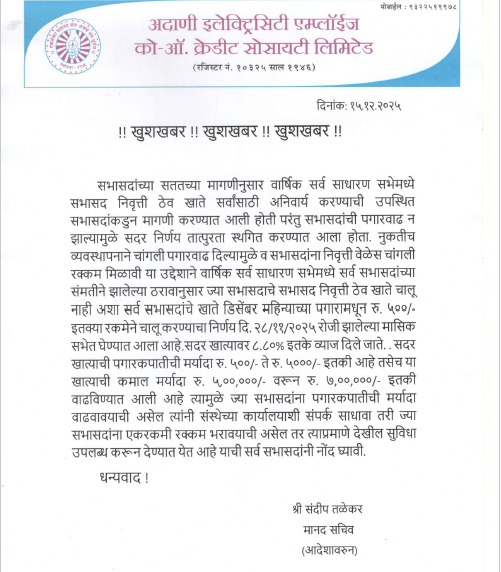 "उत्त्पन्नापेक्षा गरजा जास्त” हे व्यस्त समीकरण मानवी जीवनातील एक न उलगडणारे कोडे आहे. आकस्मित ओढवणारे दुर्धर प्रसंग, संकटे, आजारीपणा वगैरे घटना मानवी जीवनात घडत असतात. अशावेळी नितांत गरज असते ती आर्थिक मदतीची. ही गरज थोड्या बहुत प्रमाणात का होईना भागविण्याचे काम सोसायटी करीत आहे. सोसायटीने सभासदांना वेगवेगळ्या प्रकारची कर्जे देऊन त्यांच्या संसारिक जीवनात बहुमोल सहाय्य करतानाच सभासदांना बचतीचे महत्व पटवून दिले आहे. सोसायटी व सभासद यांचे संबंध इतके जिव्हाळ्याचे आहेत की त्यामुळेच सोसायटी, आस्थापनातील एक प्रमुख अंग बनली आहे आणि म्हणूनच "एकमेका सहाय्य करू, अवघे धरू सुपंथ" हे संयुक्तीक ब्रीदवाक्य असलेल्या ह्या सोसायटीचे सभासदस्यत्व आपल्या आस्थापनाच्या बहुसंख्य कर्मचा-यांनी स्विकारले आहे.